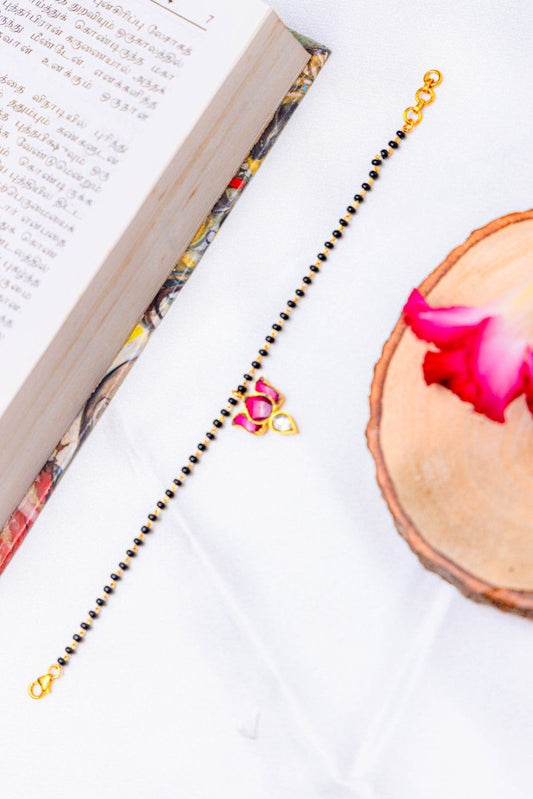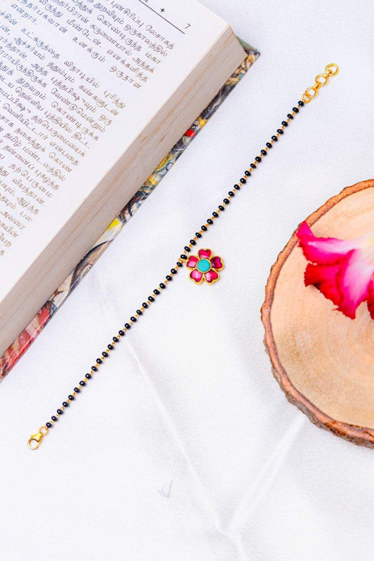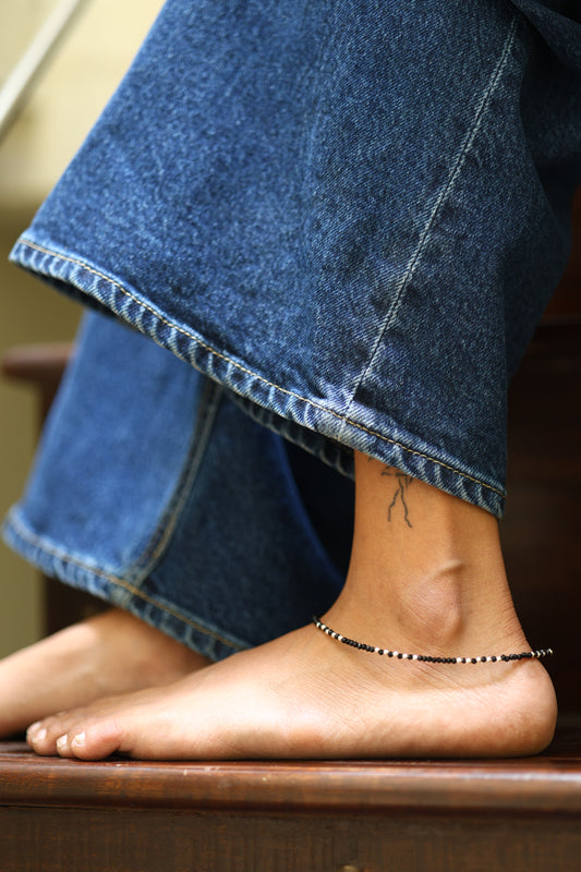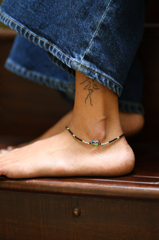 Black Beaded with Multicolor Butterfly Charm Silver Anklet