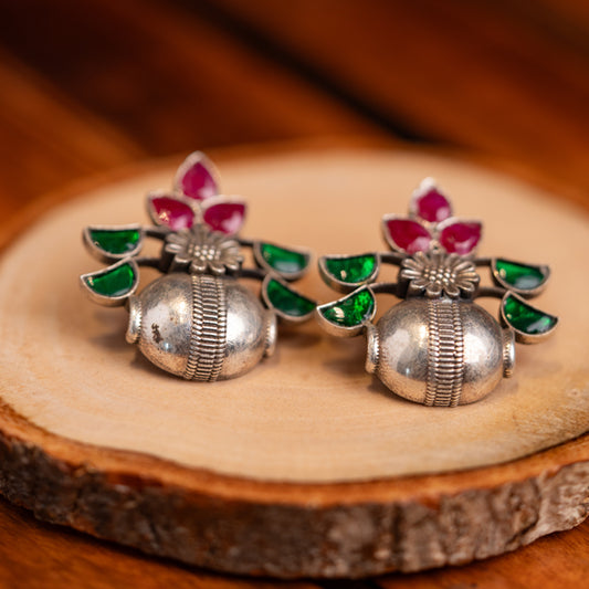 Handcrafted Silver Earrings with Pink & Green Floral Stones