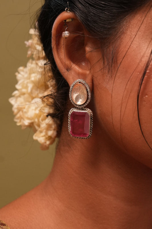 Handcrafted Silver Temple Earrings with Ruby Stone