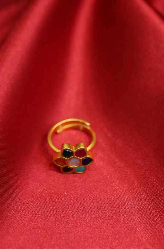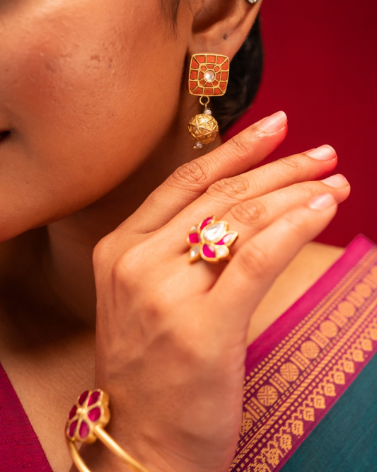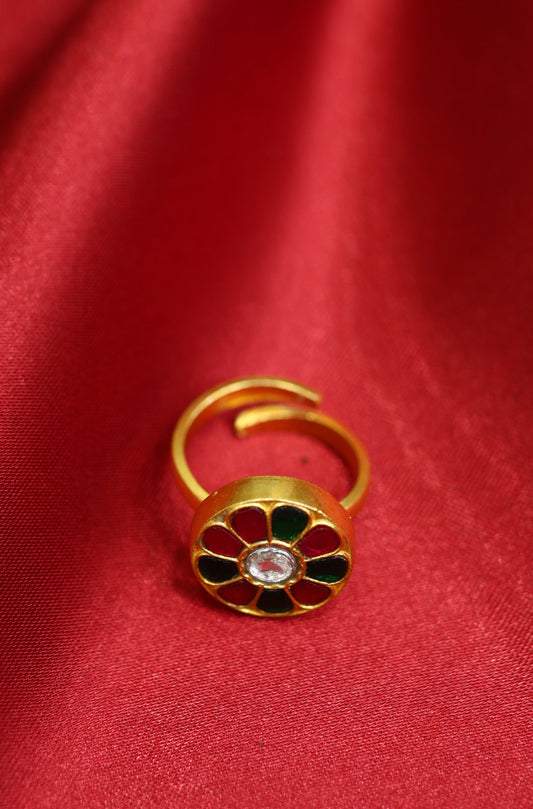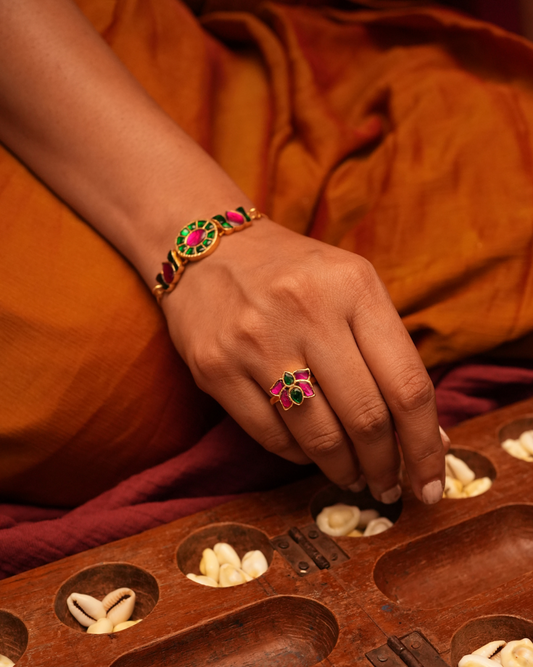 Handcrafted Kundan Floral Ring – Red & Green Gemstones