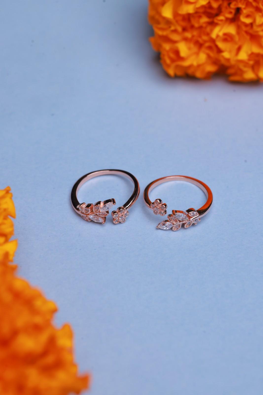 The polished rose gold finish adds warmth and sophistication, while the intricate floral elements bring a soft, feminine charm. Perfect for pairing with sarees, ethnic wear, or even casual outfits, this toe ring adds subtle sparkle and elegance to every step. Whether worn daily or styled for festive occasions, it’s a timeless accessory that complements any look effortles