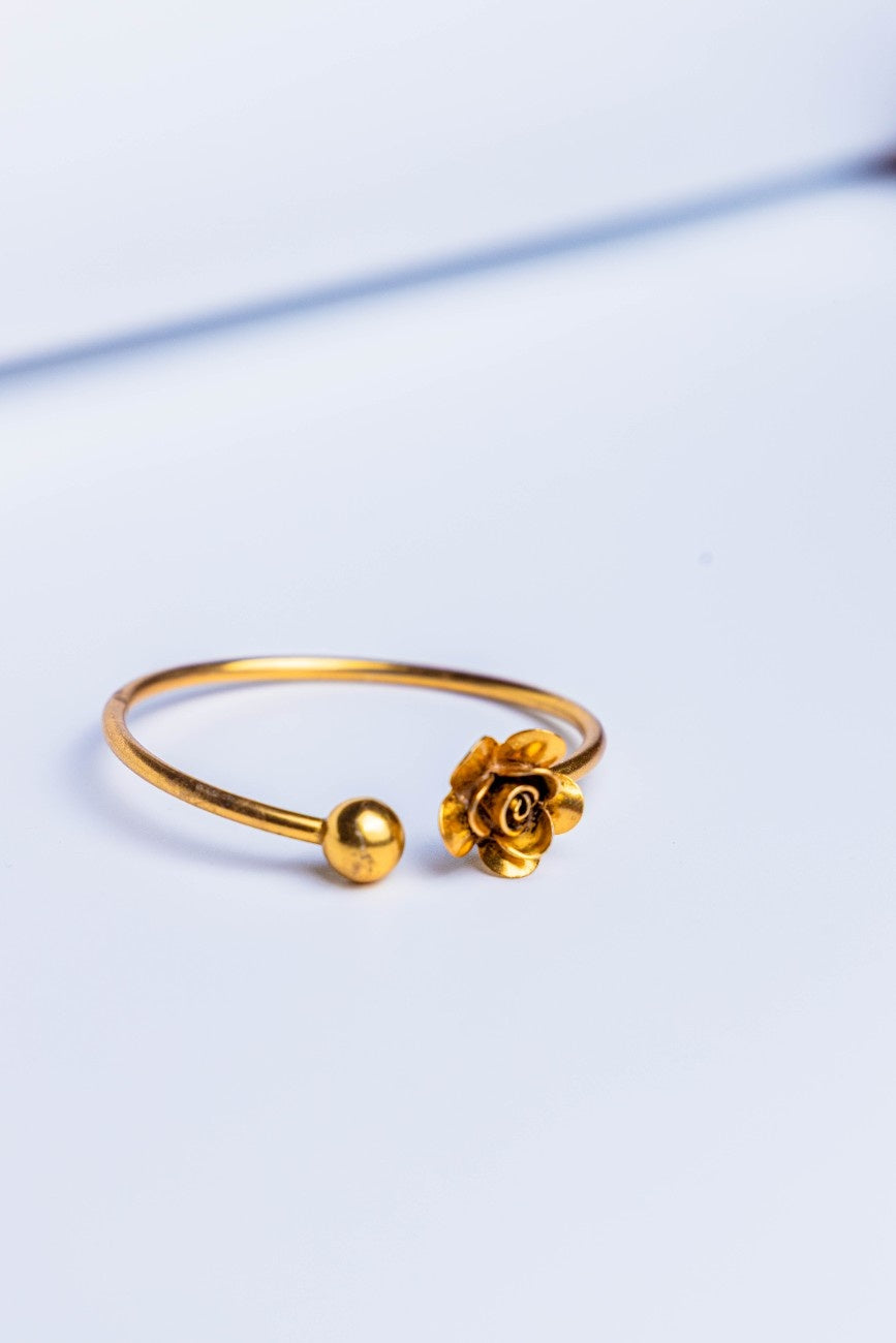 Introducing the Classic Gold-Tone Gadi Bangle, a graceful everyday accessory designed to blend tradition with modern elegance. Featuring a beautifully carved rose motif on one end and a smooth rounded bead on the other, this gadi-style bangle adds a touch of cultural charm to your daily look.